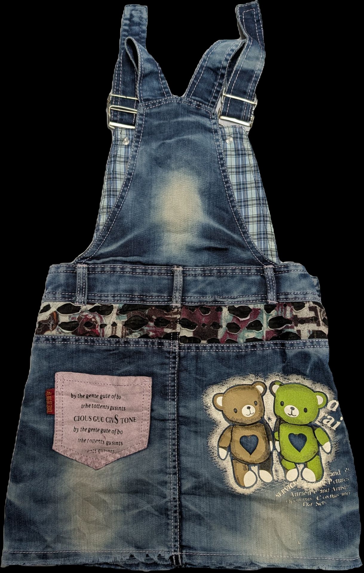 Add a touch of playful charm to your little girl’s wardrobe with this unique Denim Dungaree Dress from BubbleBee. Crafted from durable, high-quality denim jeans fabric, this dress features eye-catching patchwork details and a stylish plaid lining on the bib. The front is adorned with sweet, embroidered bear graphics and vibrant heart accents, making it a standout piece for any casual occasion.
